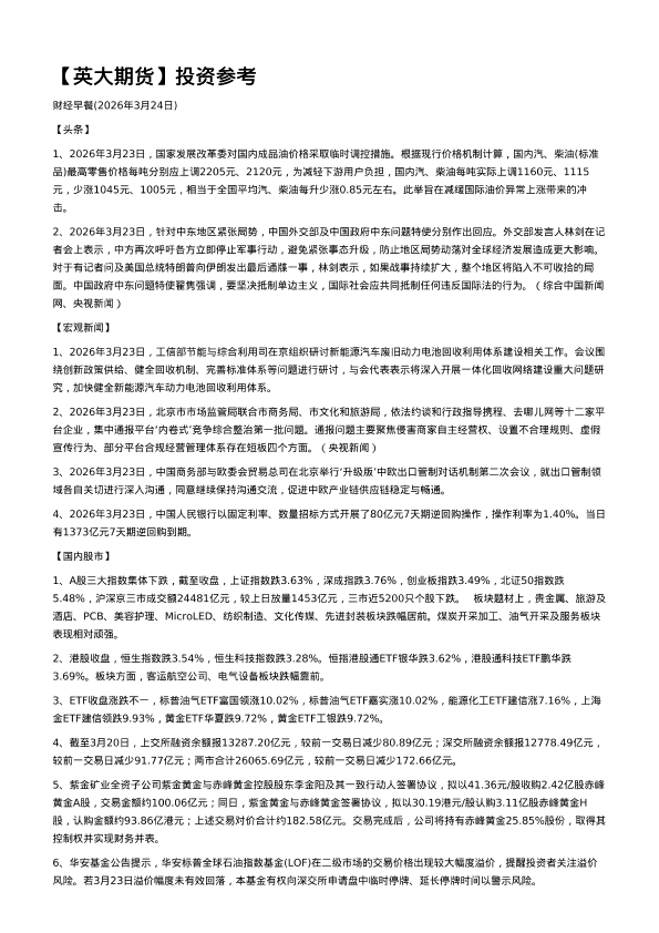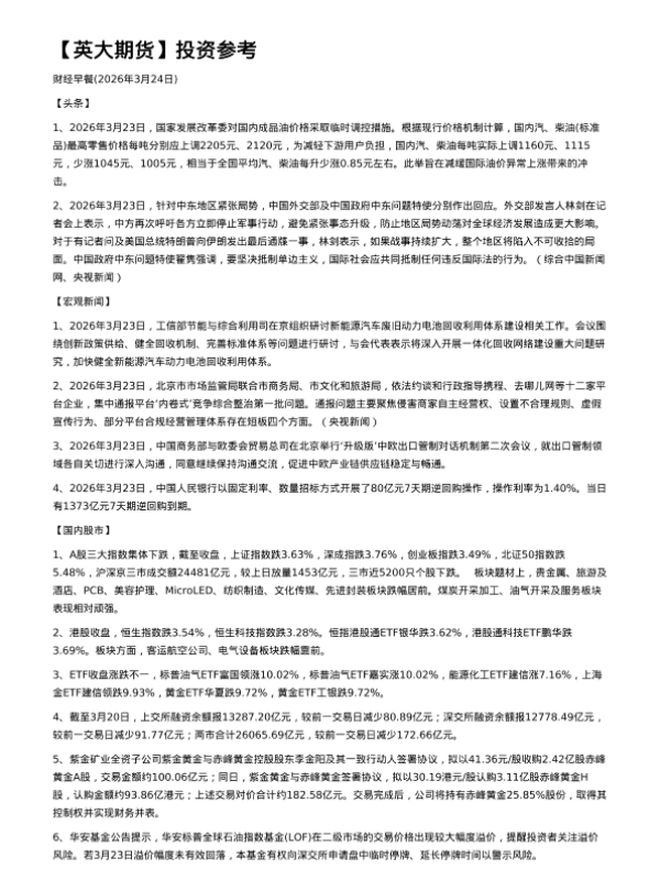 【英大期货】【202603】投资参考 财经早餐(2026年3月24日)-2页