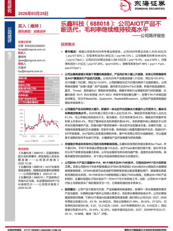 【东海证券】【202603】乐鑫科技(688018):公司AIOT产品不断迭代,毛利率继续维持较高水平——公司简评报告-4页