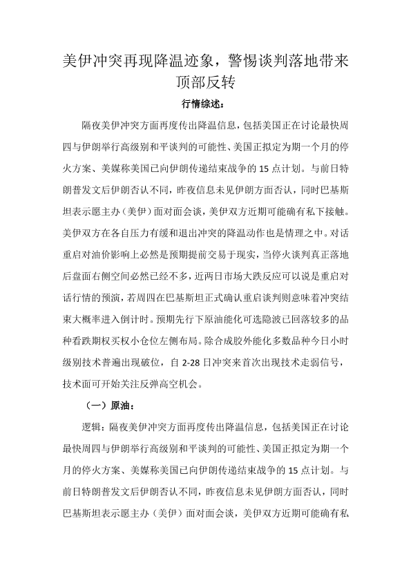 【天富期货有限公司】【202603】美伊冲突再现降温迹象,警惕谈判落地带来顶部反转-14页