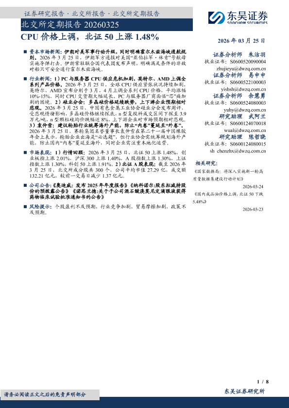 【东吴证券】【202603】CPU价格上调,北证 50上涨 1.48%-8页