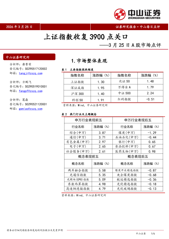 【中山证券】【202603】上证指数收复3900点关口——3月25日 A股市场点评-6页