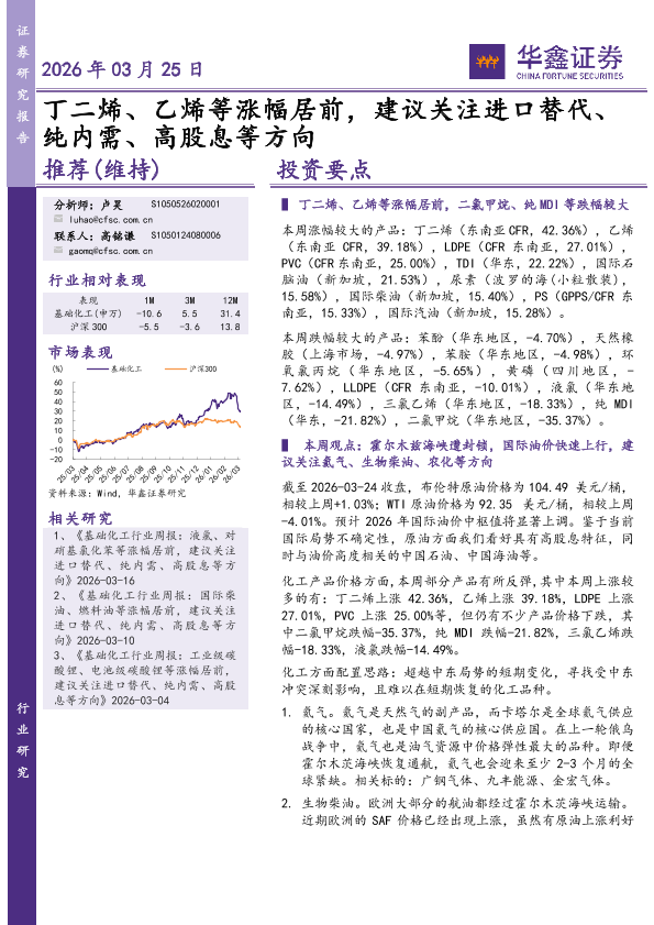 【华鑫证券】【202603】2026年03月25日 丁二烯、乙烯等涨幅居前,建议关注进口替代、纯内需、高股息等方向-33页
