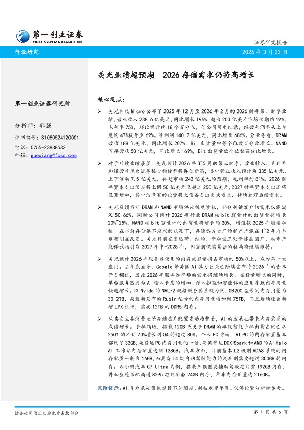 【第一创业证券】【2025】美光业绩超预期 2026存储需求仍将高增长-6页