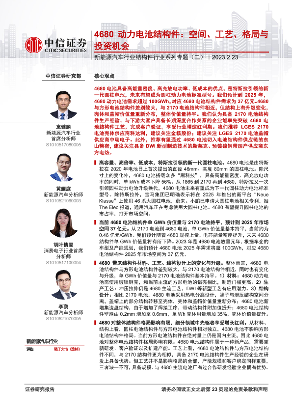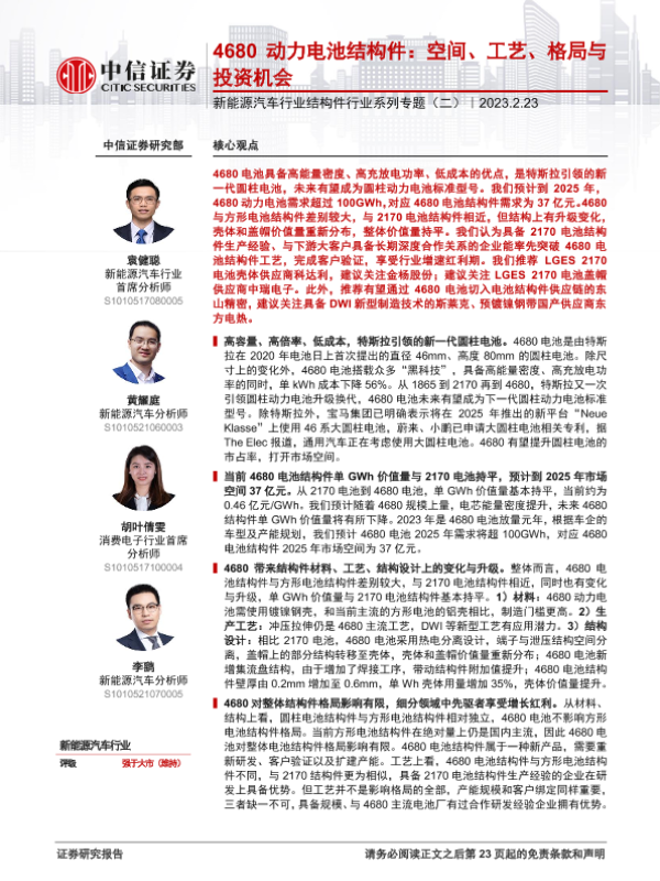 【中信证券】【20230223】新能源汽车行业结构件行业系列专题(二):4680动力电池结构件,空间、工艺、格局与投资机会-24页