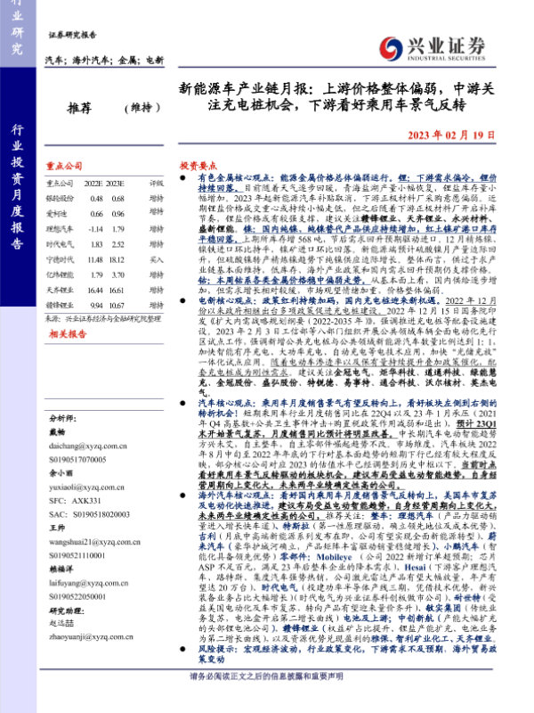 【兴业证券】【20230219】新能源车产业链月报:上游价格整体偏弱,中游关注充电桩机会,下游看好乘用车景气反转-38页
