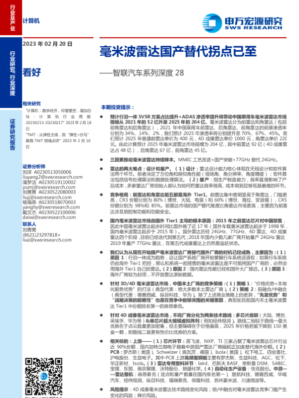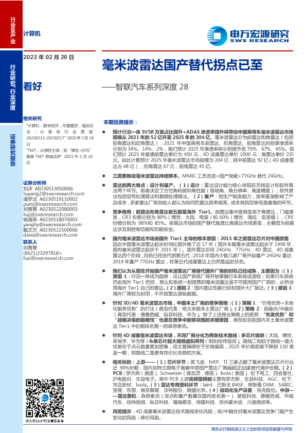 【申万宏源】【20230220】智联汽车行业系列深度28:毫米波雷达国产替代拐点已至-52页
