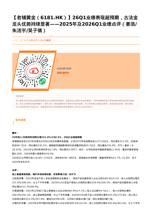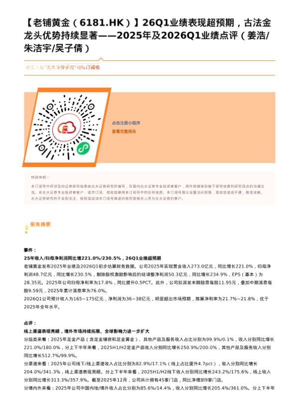 【光大证券】【202603】老铺黄金6181.HK)26Q1业绩表现超预期,古法金龙头优势持续显著——2025年及2026Q1业绩点评-2页