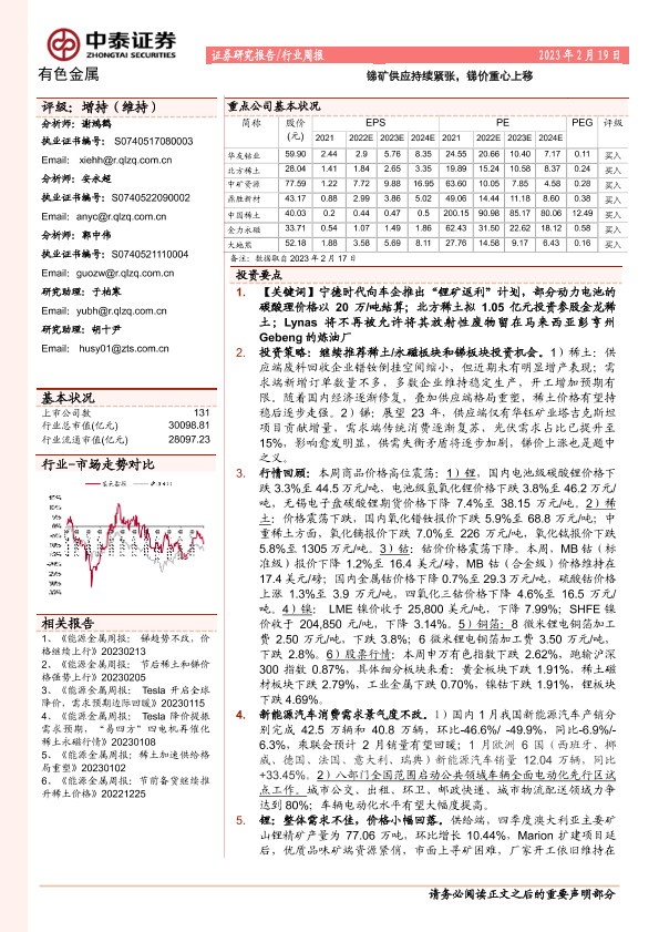 【中泰证券】【20230219】有色金属行业周报:锑矿供应持续紧张,锑价重心上移-24页
