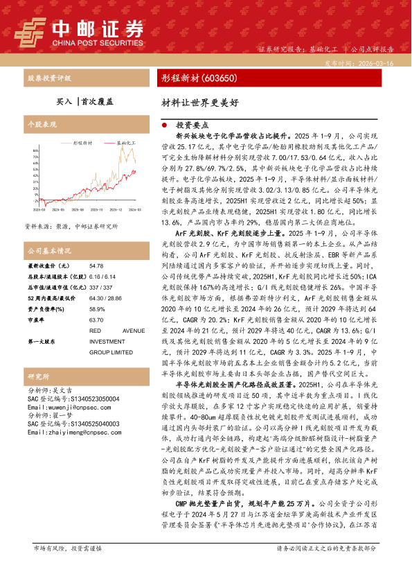 【中邮证券】【202603】彤程新材(603650):半导体光刻胶全国产化路径成效显著,首次覆盖给予买入评级-6页