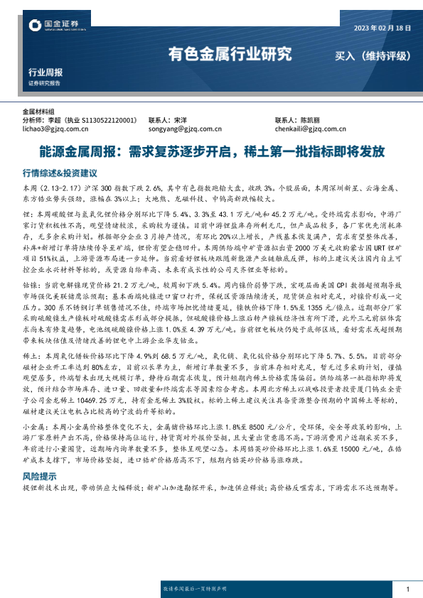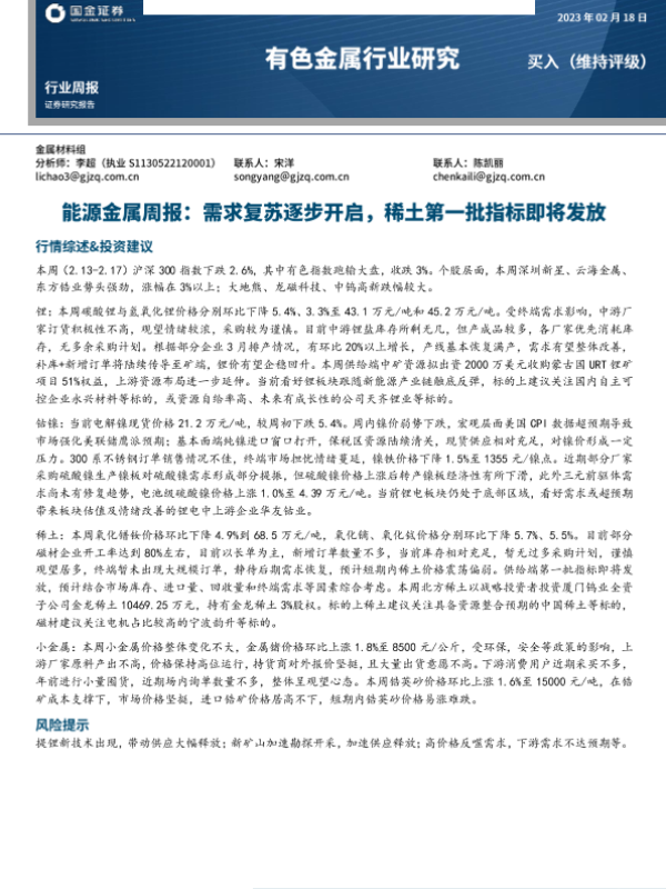 【国金证券】【20230218】有色金属行业能源金属周报:需求复苏逐步开启,稀土第一批指标即将发放-16页