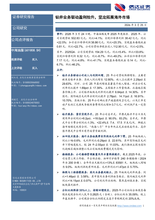 分红政策 盈利增长 海外拓展 钻井业务 中海油服