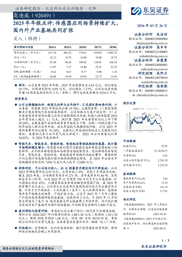【东吴证券】【202603】奥迪威(920491):2025年年报点评:传感器应用场景持续扩大,国内外产业基地共同扩张-3页