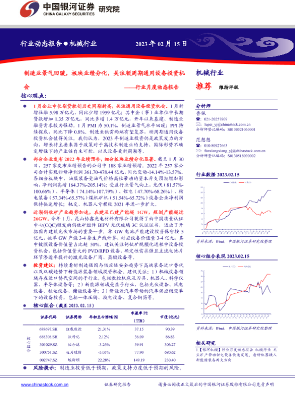 【银河证券】【20230215】机械行业月度动态报告:制造业景气回暖,板块业绩分化,关注顺周期通用设备投资机会-30页