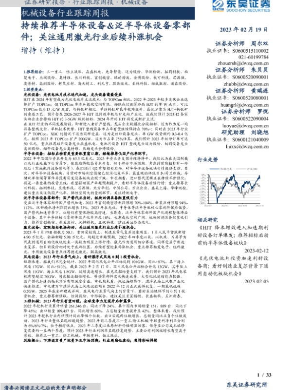 【东吴证券】【20230219】机械设备行业跟踪周报:持续推荐半导体设备&泛半导体设备零部件;关注通用激光行业后续补涨机会-33页