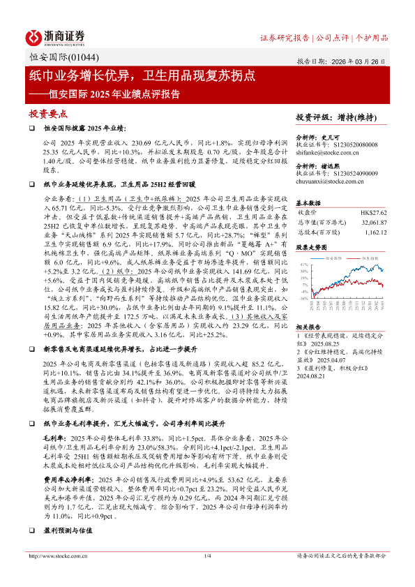 【浙商证券】【202603】纸巾业务增长优异,卫生用品现复苏拐点——恒安国际2025年业绩点评报告-4页
