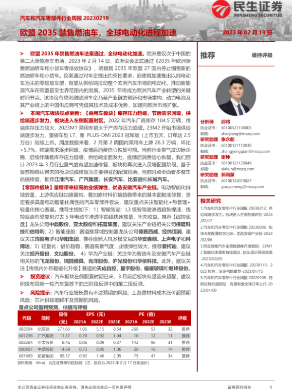 【民生证券】【20230219】汽车和汽车零部件行业周报:欧盟2035禁售燃油车,全球电动化进程加速-29页