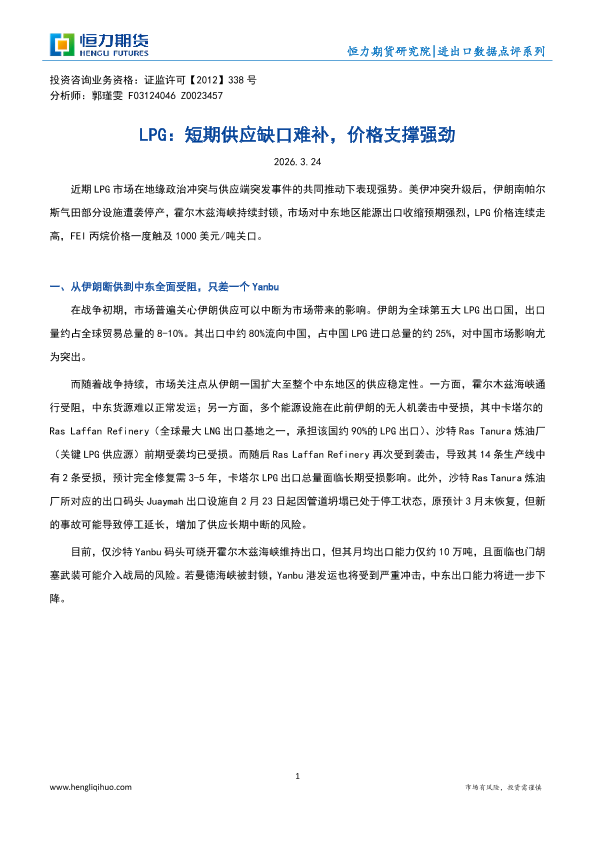 【恒力期货】【202603】LPG:短期供应缺口难补,价格支撑强劲-6页