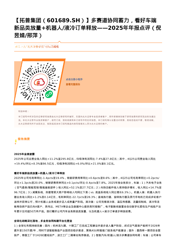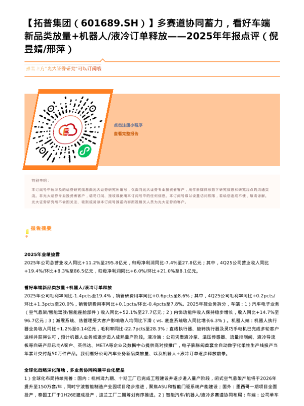 【光大证券】【202603】拓普集团(601689.SH)多赛道协同蓄力,看好车端新品类放量+机器人/液冷订单释放——2025年年报点评-2页