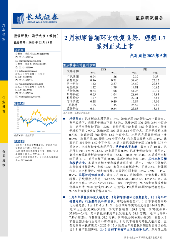 【长城证券】【20230213】汽车行业周报2023第5期:2月初零售端环比恢复良好,理想L7系列正式上市-26页