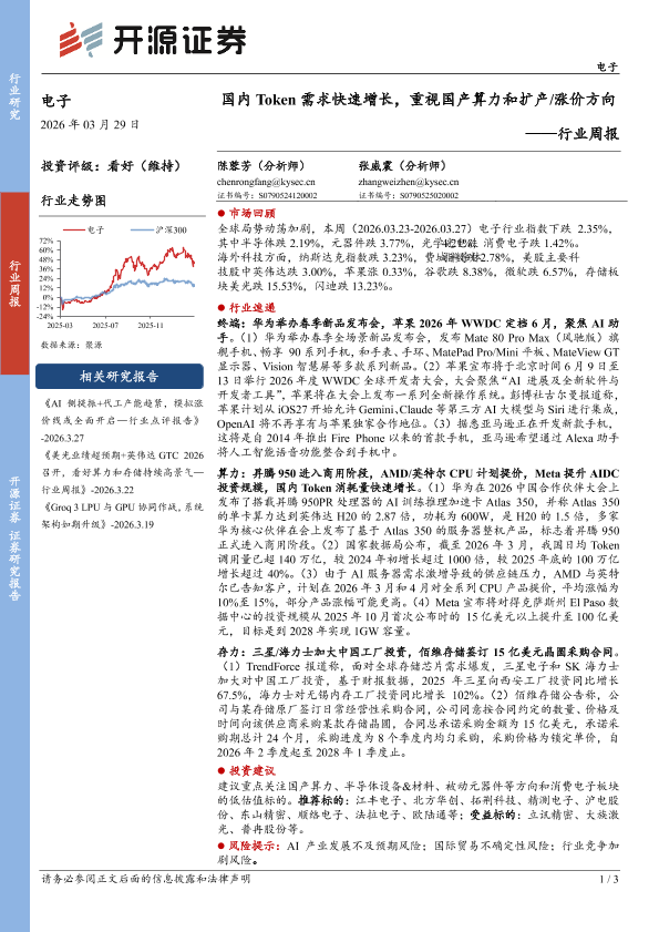 【开源证券】【202603】国内 Token需求快速增长,重视国产算力和扩产/涨价方向——行业周报-3页