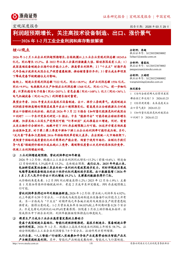 【浙商证券】【202603】利润超预期增长,关注高技术设备制造、出口、涨价景气——2026年1-2月工业企业利润和库存数据解读-8页