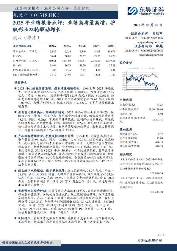 【东吴证券】【202603】毛戈平(01318.HK):2025年业绩报告点评:业绩高质量高增,护肤彩妆双轮驱动增长-3页