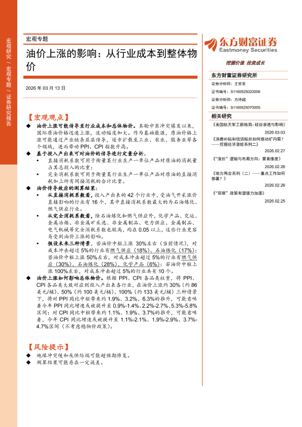 【东方财富证券】【202603】油价上涨的影响:从行业成本到整体物价-11页