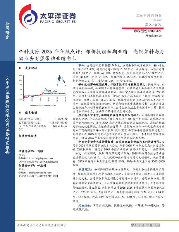 【太平洋证券】【202603】帝科股份2025年年报点评:银价扰动短期业绩,高铜浆料与存储业务有望带动业绩向上-5页