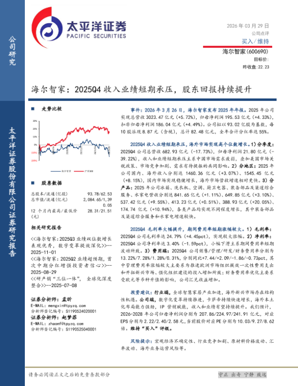 【太平洋证券】【202603】海尔智家:2025Q4收入业绩短期承压,股东回报持续提升-5页