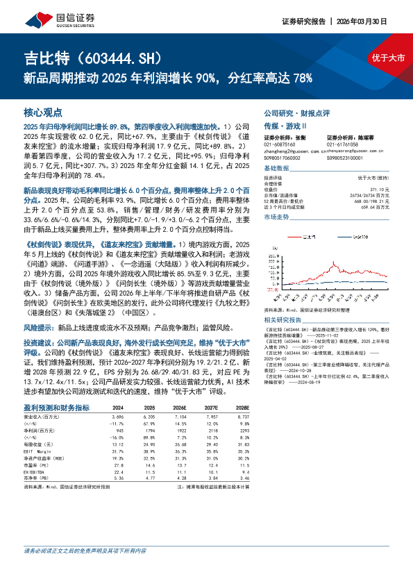 财报点评 吉比特 游戏 盈利预测 AI技术