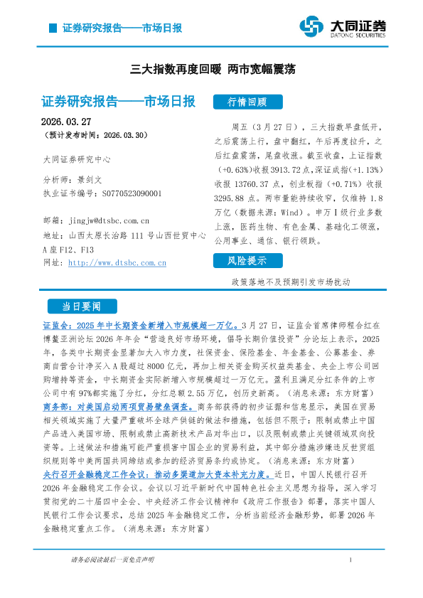 【大同证券研究中心】【202603】市场日报:三大指数再度回暖 两市宽幅震荡-5页