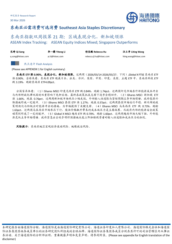 【海通国际】【202603】东南亚指数双周报第21期:区域表现分化,新加坡领涨-18页