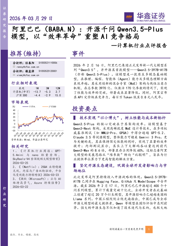【华鑫证券】【202603】阿里巴巴(BABA.N):开源千问 Qwen3.5-P lus 模型,以“效率革命”重塑 A I竞争格局-4页