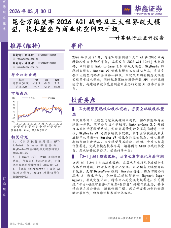 【华鑫证券】【202603】昆仑万维发布2026 AGI战略及三大世界级大模型,技术壁垒与商业化空间双升级-4页
