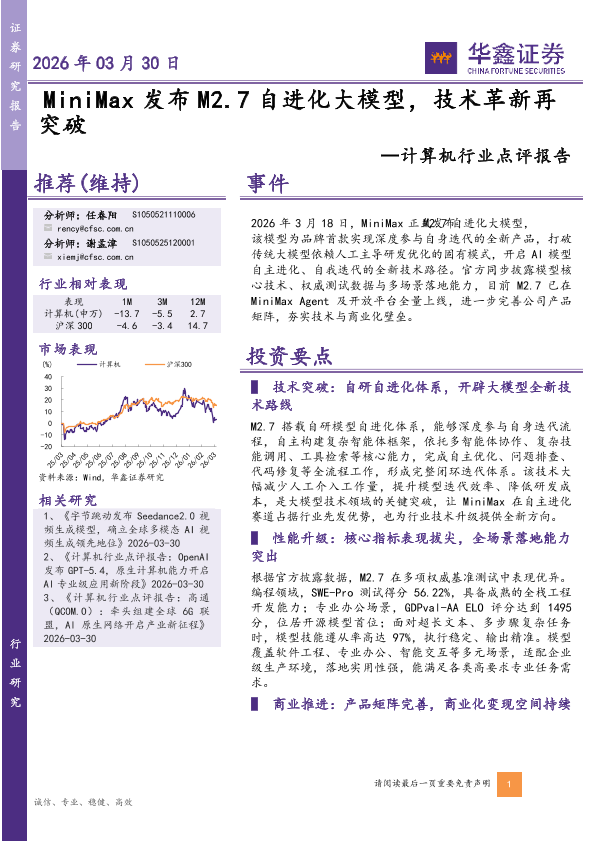 【华鑫证券】【202603】计算机行业点评报告:MiniMax发布M2.7自进化大模型,技术革新再突破-4页