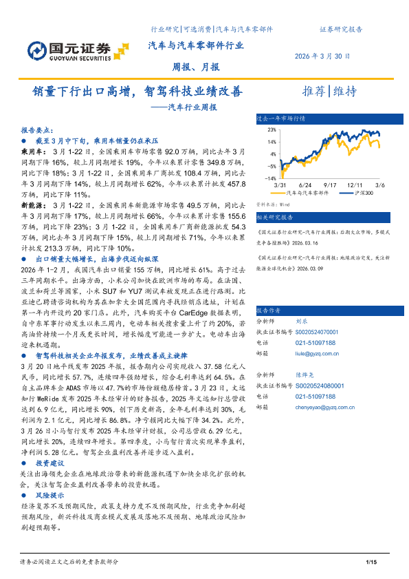 【国元证券】【202603】汽车行业周报:销量下行出口高增,智驾科技业绩改善-15页