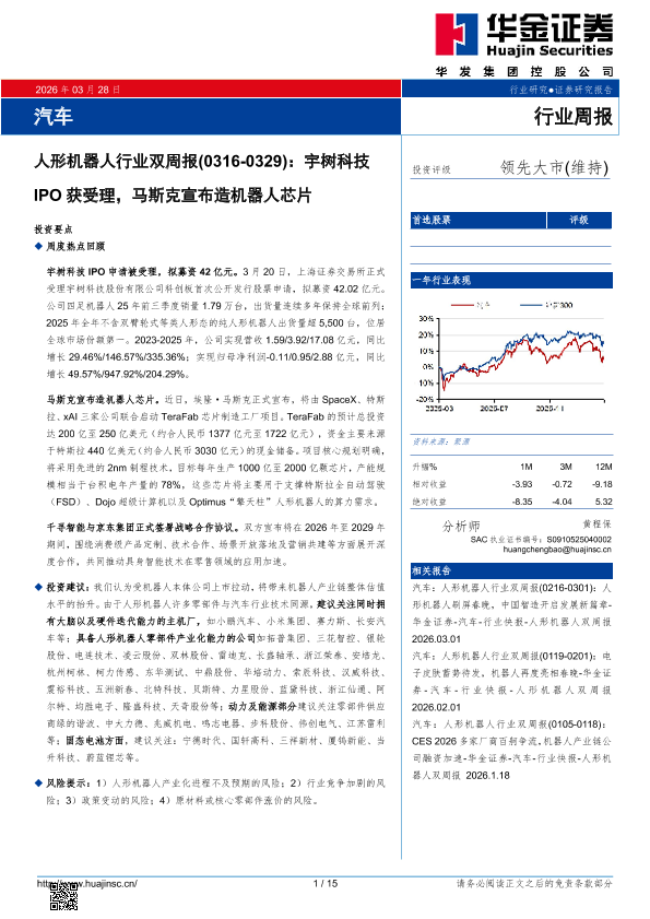 【华金证券】【202603】人形机器人行业双周报(0316-0329):宇树科技IPO获受理,马斯克宣布造机器人芯片-15页