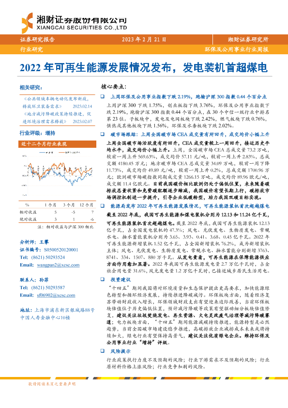 【湘财证券】【20230221】环保及公用事业行业周报:2022年可再生能源发展情况发布,发电装机首超煤电-15页
