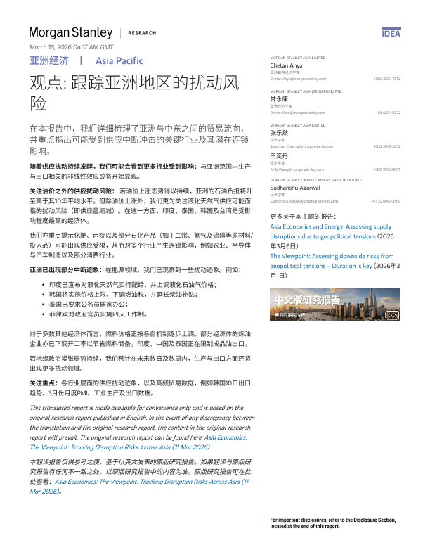【Morgan Stanley Asia Limited&Morgan Stanley Asia (Singapore) Pte.】【202603】亚洲经济:观点-跟踪亚洲地区的扰动风险-39页