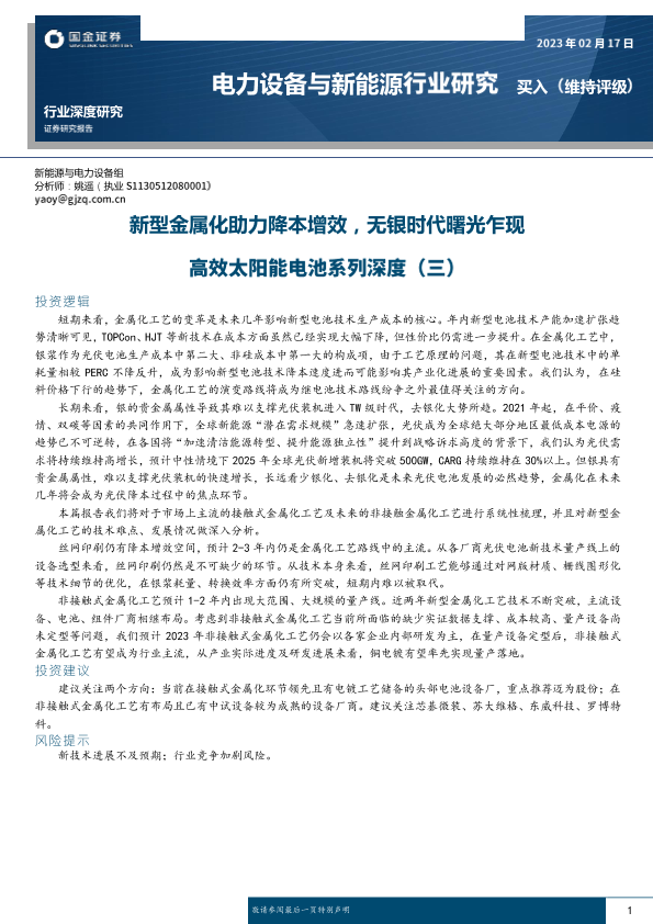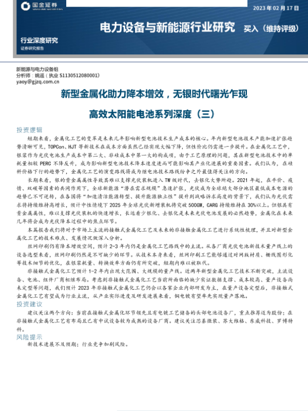 【国金证券】【20230217】电力设备与新能源行业高效太阳能电池系列深度(三):新型金属化助力降本增效,无银时代曙光乍现-23页