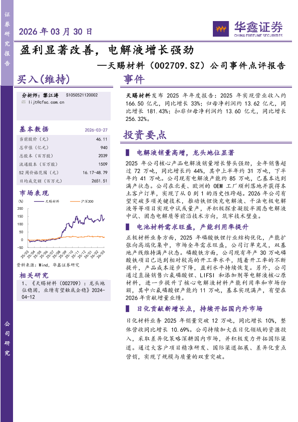 【华鑫证券】【202603】盈利显著改善,电解液增长强劲-5页