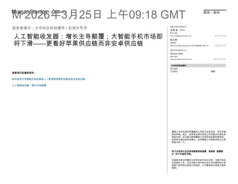 【Morgan Stanley】【202603】人工智能收发器 增长主导颠覆 大智能手机市场即将下滑——更看好苹果供应链而非安卓供应链-53页