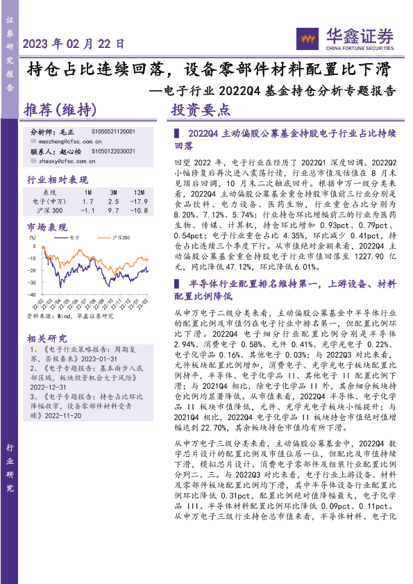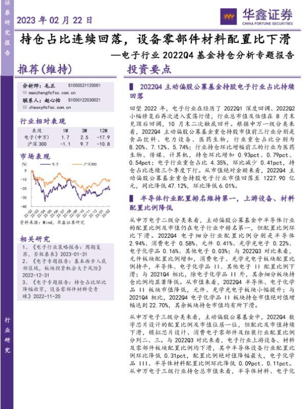 【华鑫证券】【20230222】电子行业2022Q4基金持仓分析专题报告:持仓占比连续回落,设备零部件材料配置比下滑-22页
