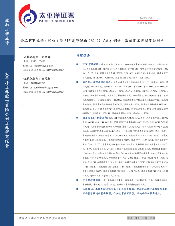 【太平洋证券】【202603】金工ETF点评:行业主题ETF周净流出262.29亿元;钢铁、基础化工拥挤变幅较大-16页