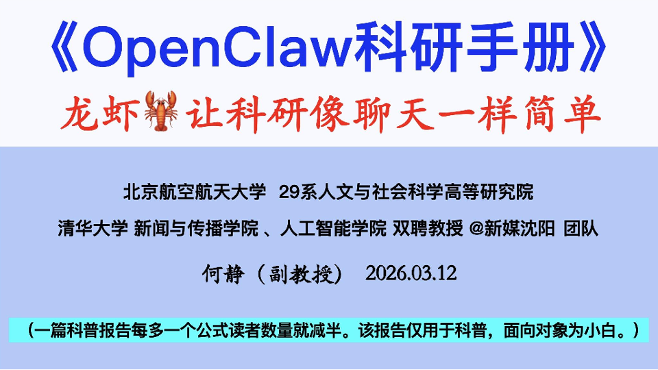 【北京航空航天大学29系人文与社会科学高等研究院&清华大学新闻与传播学院&人工智能学院双聘教授@新媒沈阳团队】【202603】OpenClaw科研手册 龙虾让科研像聊天一样简单-38页