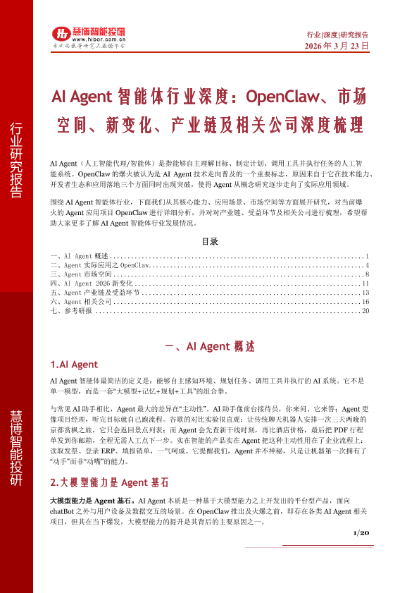 【慧博智能投研】【202603】AI Agent智能体行业深度:OpenClaw、市场空间、新变化、产业链及相关公司深度梳理-20页