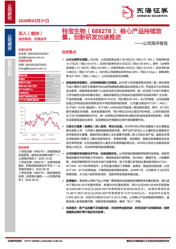 【东海证券】【202603】特宝生物(688278):核心产品持续放量,创新研发加速推进——公司简评报告-4页