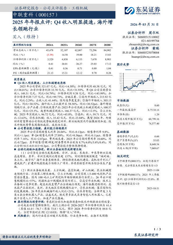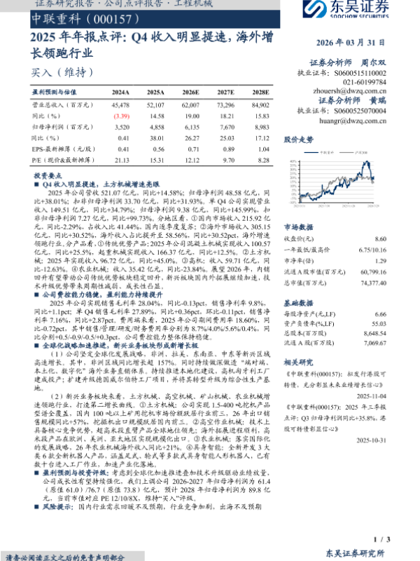 全球化战略 土方机械 中联重科 工程机械 盈利预测