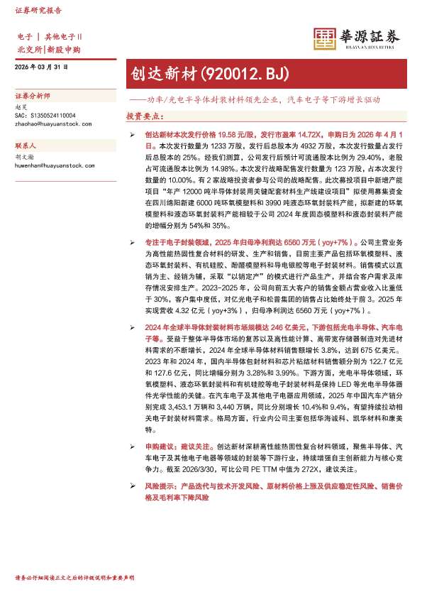 【华源证券】【202603】创达新材(920012.BJ)——功率/光电半导体封装材料领先企业,汽车电子等下游增长驱动-16页