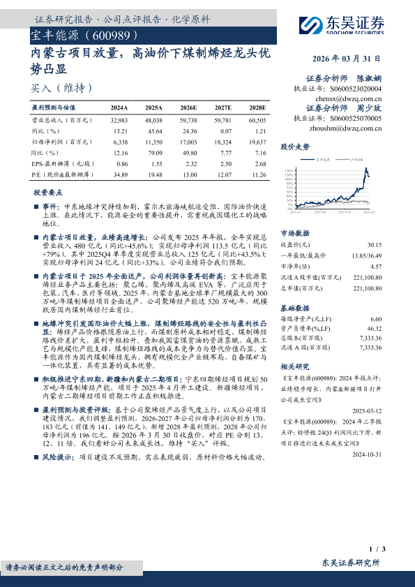 【东吴证券】【202603】内蒙古项目放量,高油价下煤制烯烃龙头优势凸显-3页